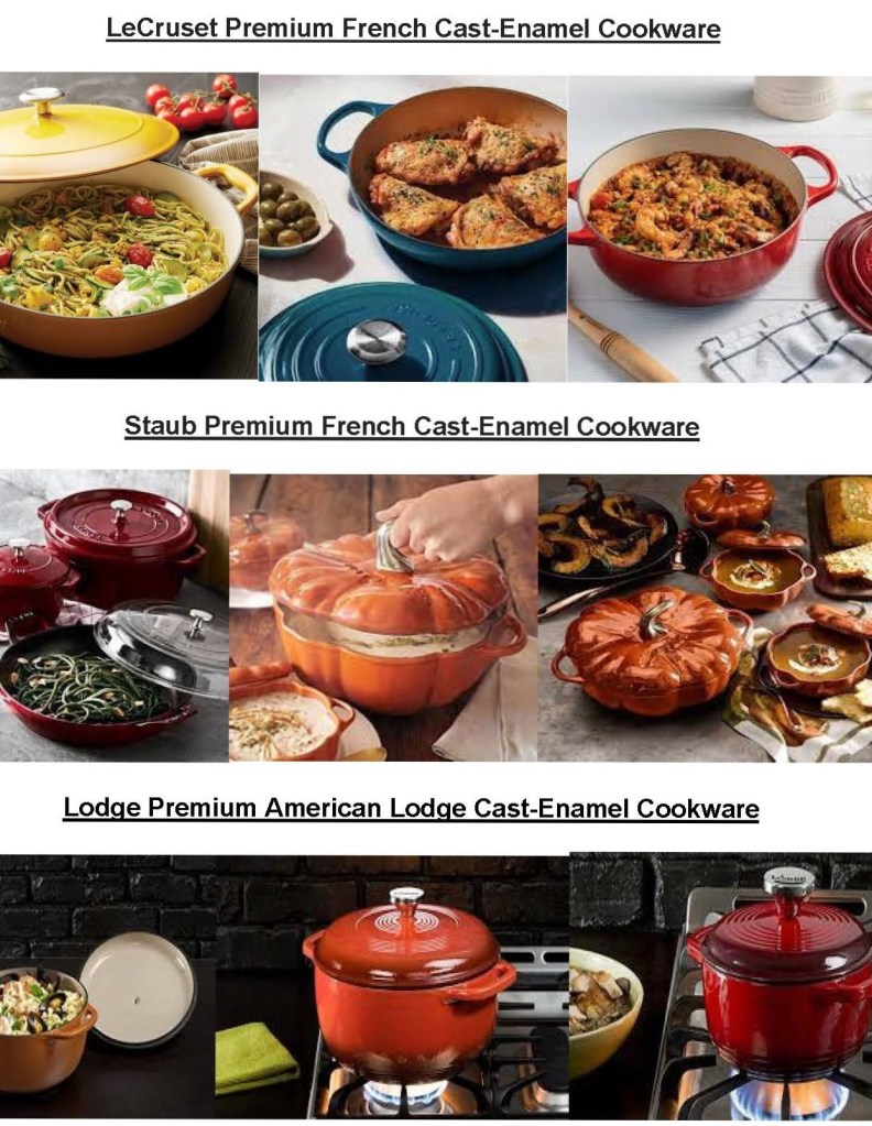 The premium French cookware brand LeCruset is the Rolls-Royce of cast-enamel cookware, followed by its French competitor Staub, coming in at a close second. The American made Lodge cookware comes in at an impressive third place, with a price point that is most affordable and is highly recommended.