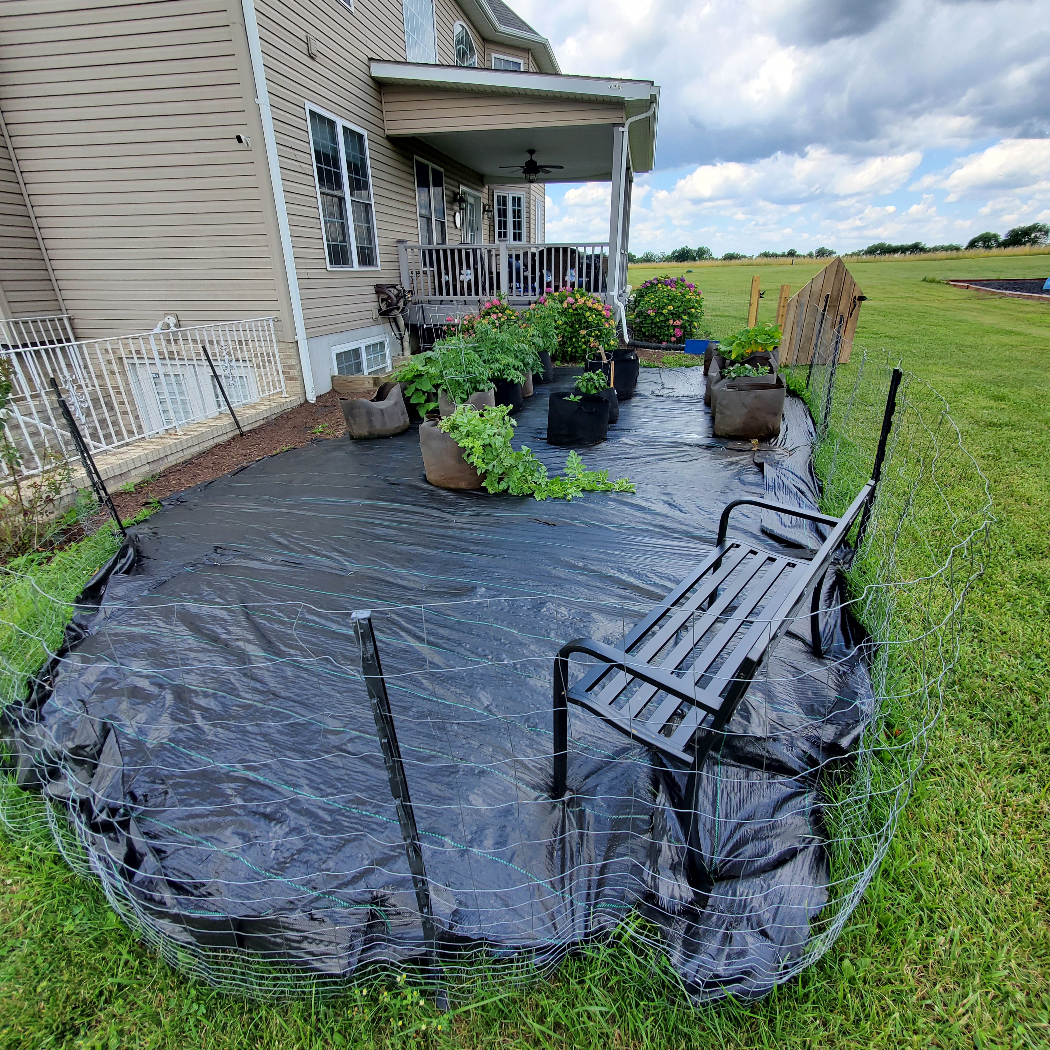 “I use landscape fabric to cover the ground of my grow-bag garden for weed-control. I added a bench for relaxation and meditation. Communing with God in His creation brings peace, serenity, and rest.”